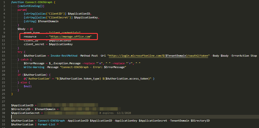 $Authorization = Connect-O365Graph -ApplicationID $ApplicationID -ApplicationKey $ApplicationSecret -TenantDomain $DirectoryID -Resource https://graph.microsoft.com