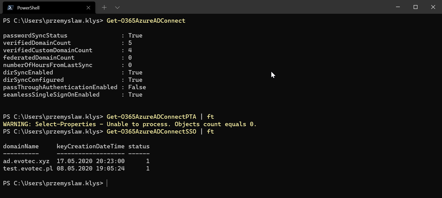 Additionally, I've exposed Azure AD Connect settings, so now it's possible to query Office 365 and get information about current Azure AD Connect settings, Pass-Thru Agents, and their status or SSO configuration.