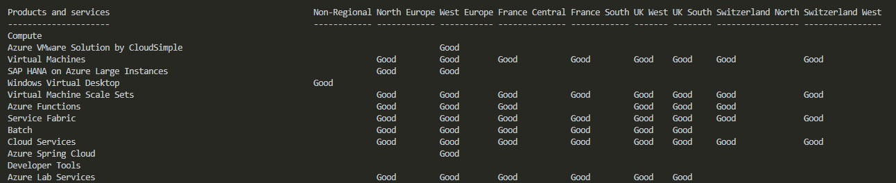 ConvertFrom-HTMLTable parses whole HTML and returns an Array of **Tables (**actually Arrays). This means we can access each table separatly. In case of Azure, there are five tables on that website and we can access them using index from 0 to 4.