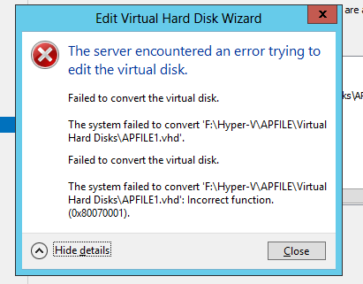 But that also shows no problems. After that next step was to try and move machine to different place. Unfortunately during machine move it also displays **Incorrect function. **Next step was to find which file was actually giving an error. Since this virtual hyper-v machine was made up of 3 files we've tried to convert all 3 from VHD to VHDX type. Unfortunately it worked for 2 out of 3 files.