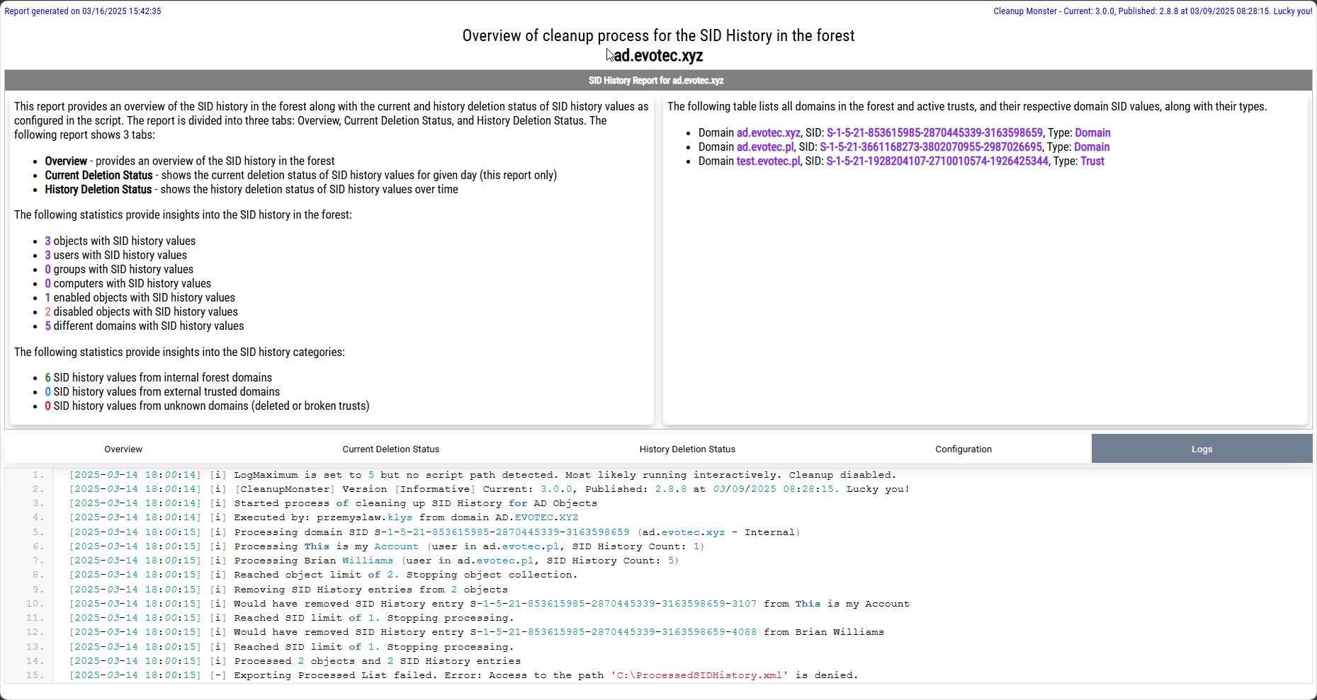 The history tab contains information about all earlier runs of SID History Cleanup and what happened. Keep in mind that the XML file must be present, as the history is kept internally. Otherwise, the history will only keep current data.