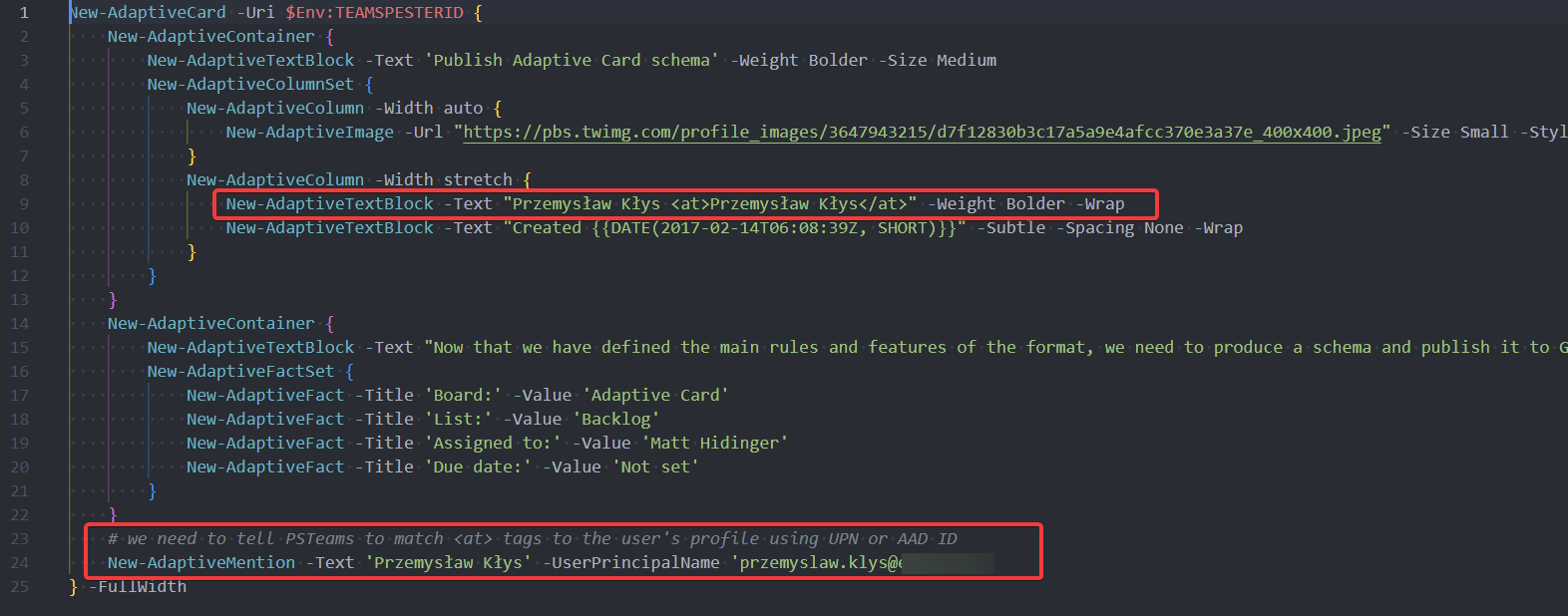 New-AdaptiveMention -Text 'Przemysław Kłys' -UserPrincipalName '[email protected]'