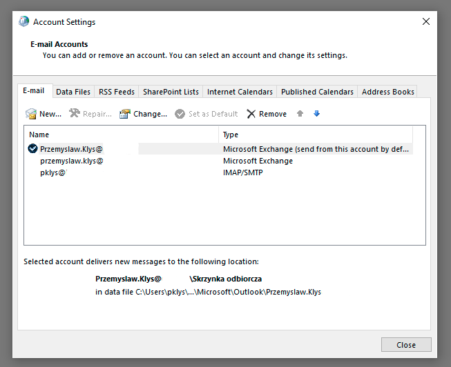 Since Office 365 autodiscover is usually setup correctly at this time Outlook shouldn't have any problems to configure new mailbox for Exchange. If you're using different Exchange server you may need to configure things manually. You can setup multiple Exchange or Office 365 accounts in Outlook this way. There's also one more thing you need to be aware of. By default Outlook chooses only small part of emails to be synchronized locally to Outlook. Since we want to migrate all emails we need to make sure all emails are available in Outlook. To do that we need to double click on our Exchange/Office 365 accounts (or choose Change) to open up additional settings.