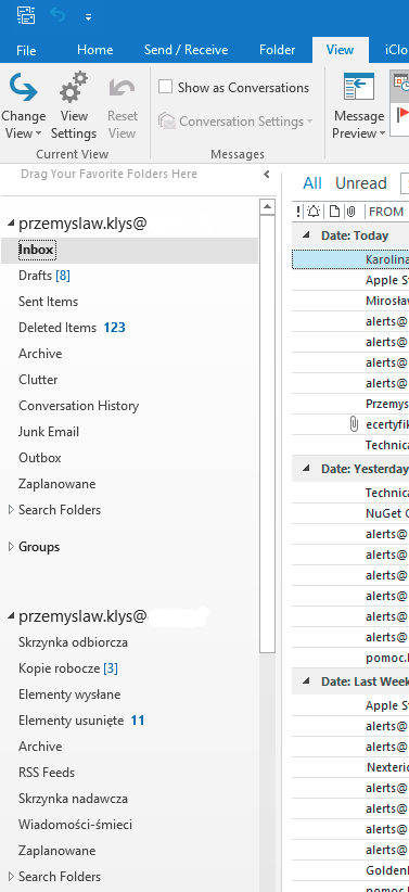 Depending if it's first setup or volume of the emails in mailboxes it may take a while for outlook to synchronize things locally. After we open Outlook we should have two Exchange (Office 365) accounts under each other. Now it's just matter of using Drag & Drop of all emails from Inbox, Sent Items, Archive, Junk Email and so on.