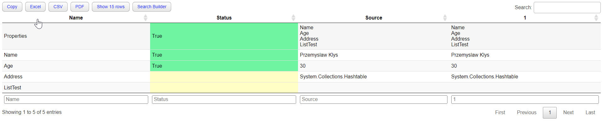 After updating Compare-MultipleObjects without much change on the PSWriteHTML module, we now get a working comparison (no more errors – hopefully). To make it more obvious, I've added some colors for the Status column where it currently says True, False, or $null and gives it colors (Green, Red, Yellow).