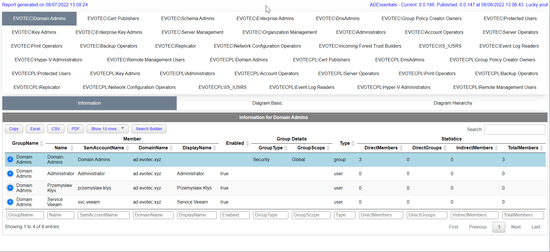 By default, the function auto-detects Active Directory Forest and scans all the domains and all the groups. Since those critical groups should be mostly empty, the default settings provided by the function should work just fine for everyone. Unfortunately, I often meet domains with not-so-clean states and recently had to add the SkipDiagram parameter, which allows me to skip generating diagrams if I meet a group with, say, 1500 nested groups. Unfortunately, with a large number of groups, the diagrams with that many groups become unreadable and challenging to load in HTML. So if you ever just want to find out nested group membership and all additional details without the need for diagrams or because the diagrams are slowing you down – you can use the SkipDiagram option just to get the meat you require.