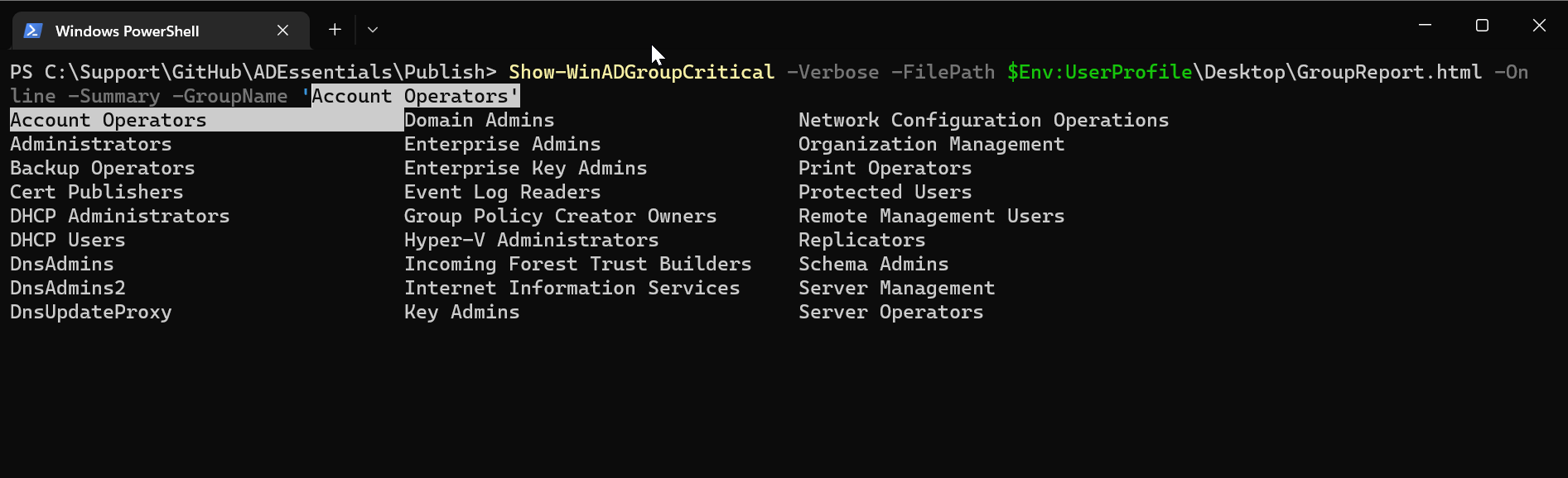 Show-WinADGroupCritical -Verbose