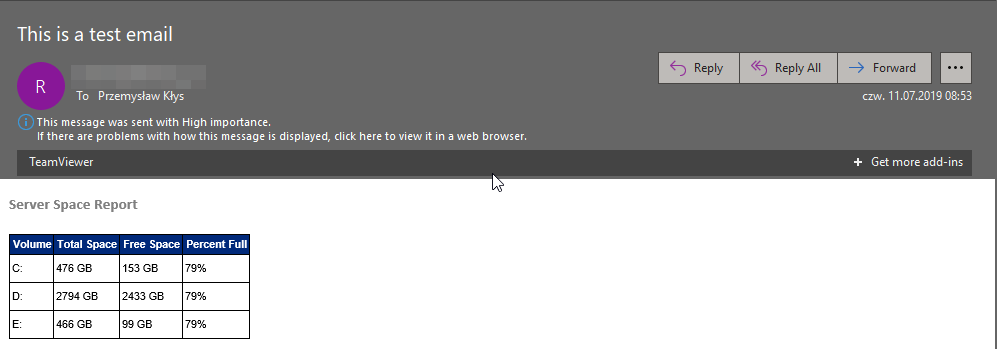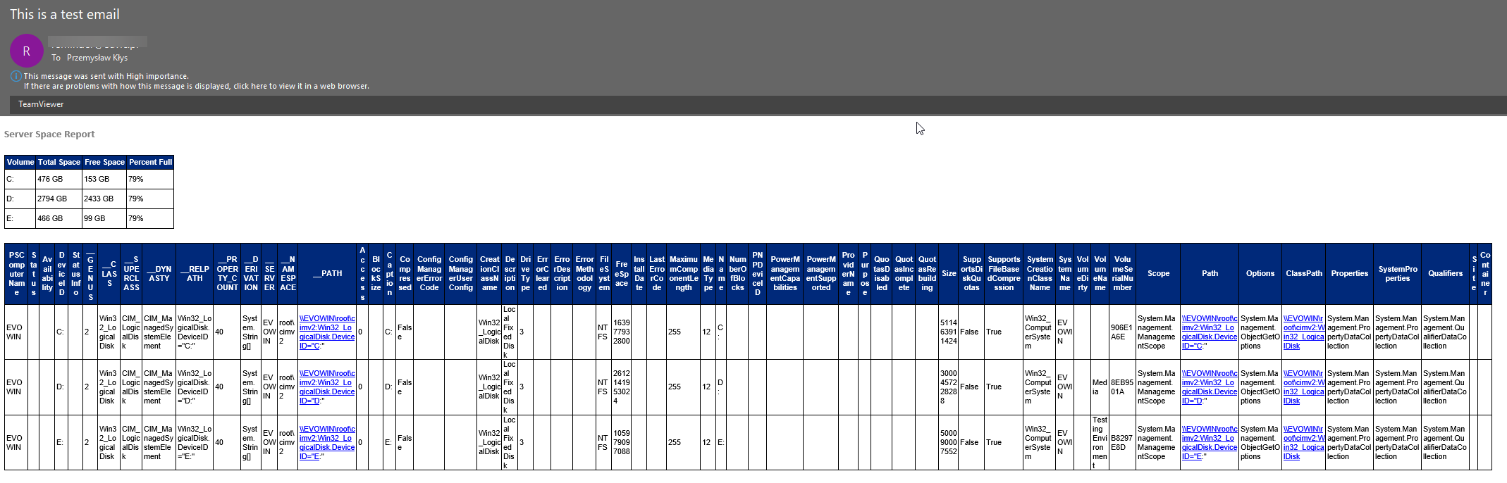 When that's done and working, there's only a matter of code. The setup and getting of disk data stay mostly the same. I left it intact although I should have used Get-CimInstance instead of **Get-WmiObject **as it's 2019 way to work with WMI classes). I've only changed the way I'm building FormattedDisk object so that I can pass this Array of PSCustomObjects into EmailTable later on. I don't need the data to be in separate variables, as shown in the example above. I treat one drive as one object, and I can display it without any effort.