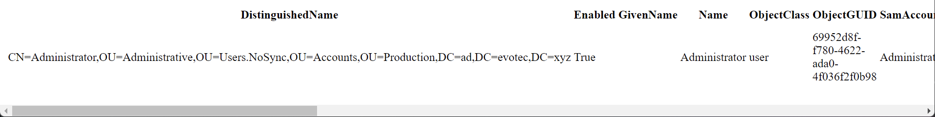Get-ADUser -Filter * | Select-object -First 1 | ConvertTo-Html