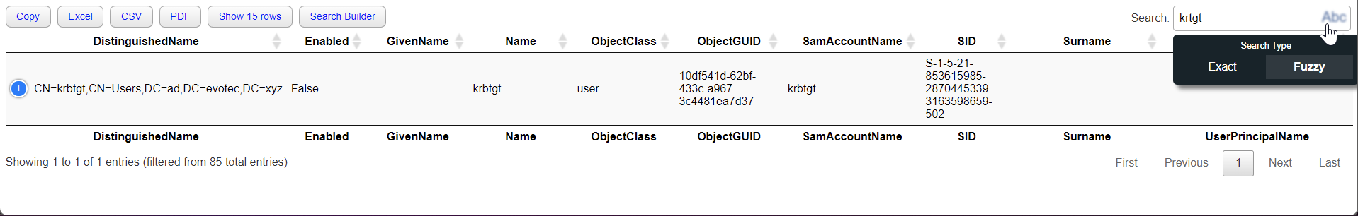 By default, you get the ability to export to Excel, CSV, and pdf. You also get a standard search and search builder, which gives you a custom way of searching thru the data. If you're interested in those options, you can find them in blog posts that I have already published. Today I wanted to talk about one new option, which is called Fuzzy Search.