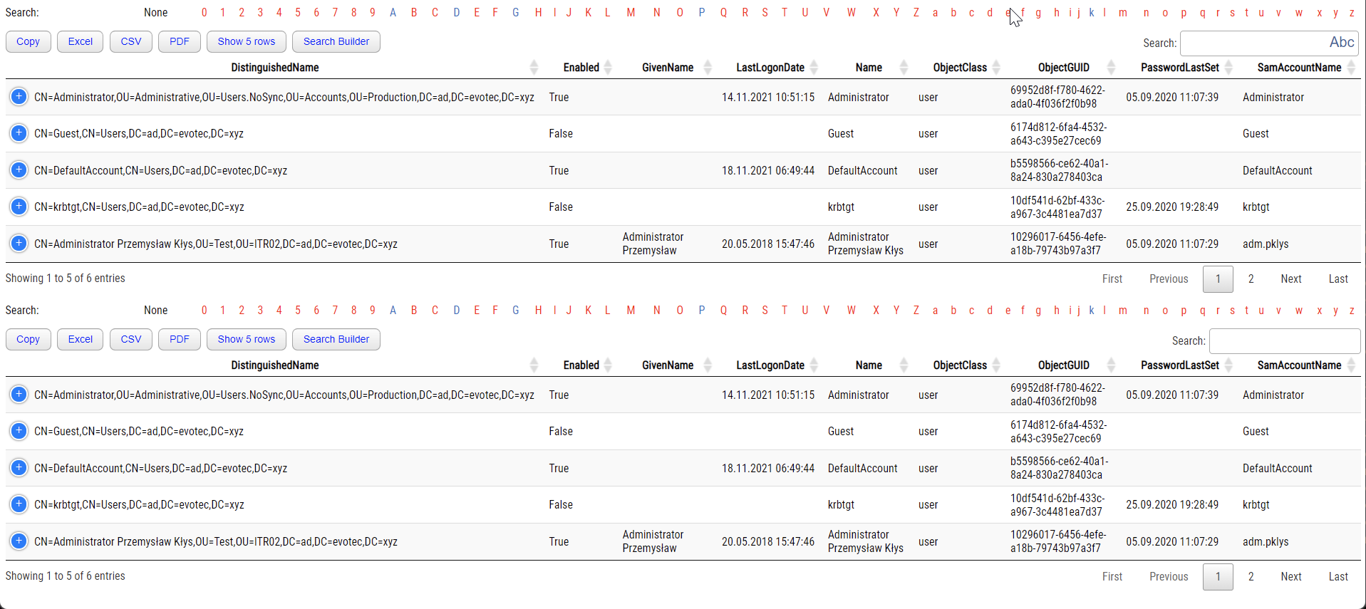 New-HTMLTable -DataTable $Users -Title 'Table with Users' -HideFooter -PagingLength 5 -FuzzySearch {
