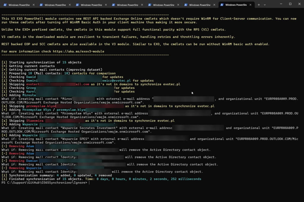 It's essential to reiterate!** Those contacts will be removed if you have contacts in the target tenant that are not on the source lists for given domains**. For the sake of exercise, if I tell it to synchronize the first 15 users but skip the first 5, the output will show that we are adding some new users, but at the same time, we try to remove those that already exist.