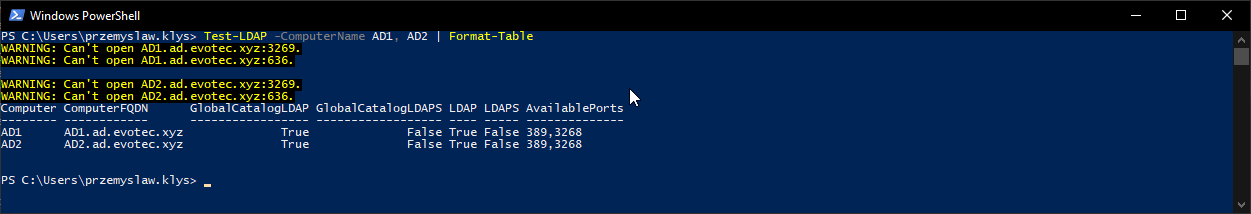 $ConnectionLDAPS = Test-LDAPPorts -ServerName $ServerName -Port $PortLDAPS