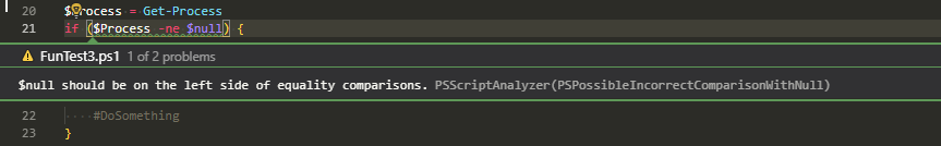 If you're using VSCode with Powershell extension, you probably got used to PSScriptAnalyzer giving you all kind of tips on optimizing things. It makes your code better. Chris Bergmeister does a great job working on it. One of the tips PSScriptAnalyzer gives you when you use $null on the right side of the comparison.