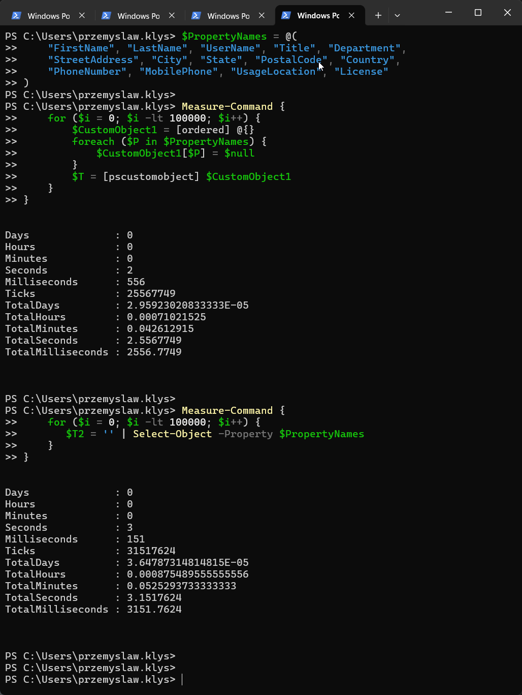 I hope this short blog post will help you decide between my and Christian solutions. Both solutions have their own strengths, and depending on who likes what, you may end up using one or the other. Christian solution is based on PowerShell 2.0 when it was the only way to create PSCustomObject.