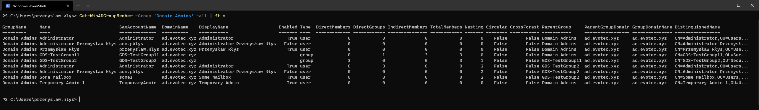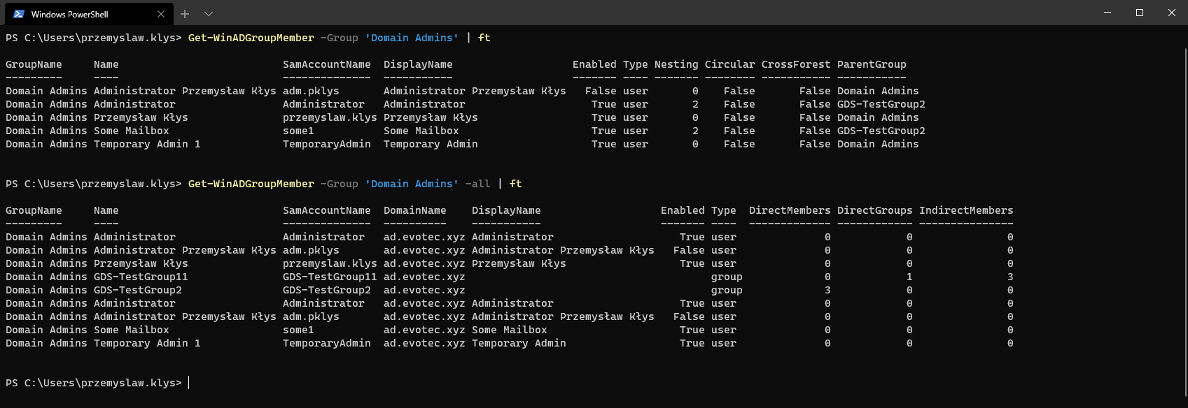Show-WinADGroupMemberOf -Identity 'przemyslaw.klys', 'adm.pklys'