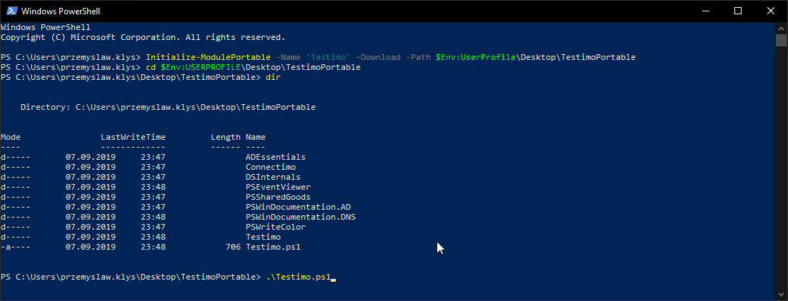 After that Invoke-Testimo and all its features are available within-session, you're using it. Of course, you don't have to use the Download switch all the time, but only when you update Testimo and it's dependencies to a newer version. If you don't use the download switch all it does is preload all modules from a given path, and that's it.