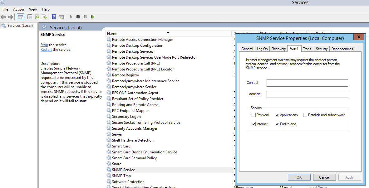 To be able to configure SNMP Service we need Agent Tab, Traps Tab, Security Tab available when opening the SNMP Service properties.